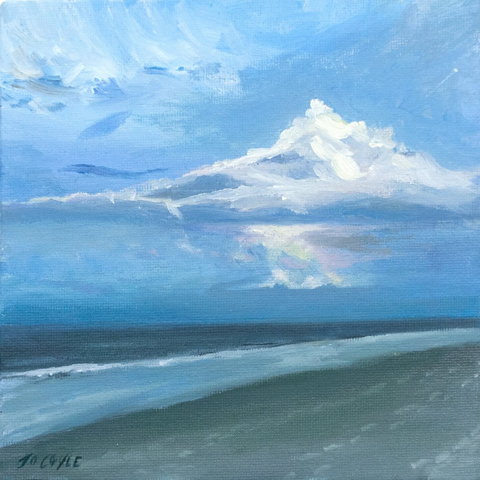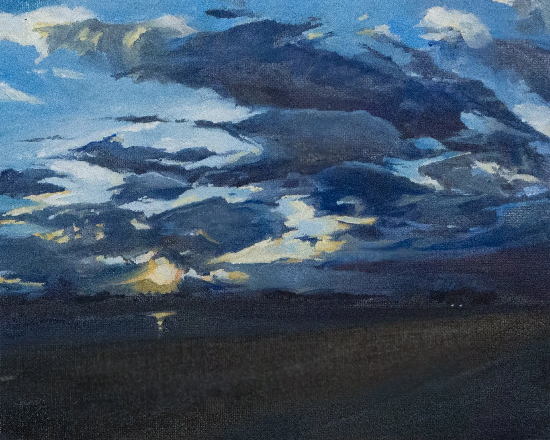 Inspired by this reaction, I created these landscapes to craft these dynamics I witnessed and produce space for viewers to respond in their own way. Throughout the collection I balanced my own emotional processes and translations with evolving technical skills, experimenting with a myriad of oil painting techniques to promote my artistic growth and to honor how light plays upon organic and manmade structures in scenes from my Freeland backyard to the skies above, and even the cold waters of Patagonia.